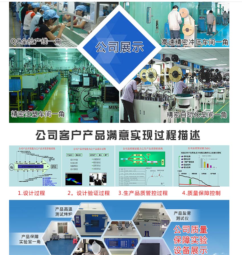 Shenzhen hejincheng Electronic Technology Co., Ltd., established in 2009, is an enterprise specializing in the design, production, sales and service of USB connector series products. Up to now, the company has more than 500 products, 1500 square meters of plant and more than 80 employees. Most of the main raw materials are imported, All the purchased materials are in line with ROHS environmental protection standards. We have the personnel, equipment and technical ability to independently produce high-speed stamping and injection molding parts, which provides a strong guarantee for product assembly and quality control. Now we have a monthly production capacity of 8.3 million connector products. Our products are widely used in mobile power supply, car charger, computer motherboard, instrument testing equipment Electrical lighting facilities and computer network, digital set top box, TV, power amplifier, Bluetooth, MP3, MP4 and other systems. We can complete your order in 5-10 days. At present, we are also building a number of fully automatic production lines. After the completion of automation, our production efficiency will be increased by 3-4 times. Five experienced R & D personnel have the ability to independently complete all operations from product development, mold design to product performance test, to provide our customers with the most competitive price products. More than 5 QC staff have carried out serious testing on our products. We are also developing and implementing automatic machine testing for some products to ensure that the customer needs are met. In principle, we continue to improve the system.
