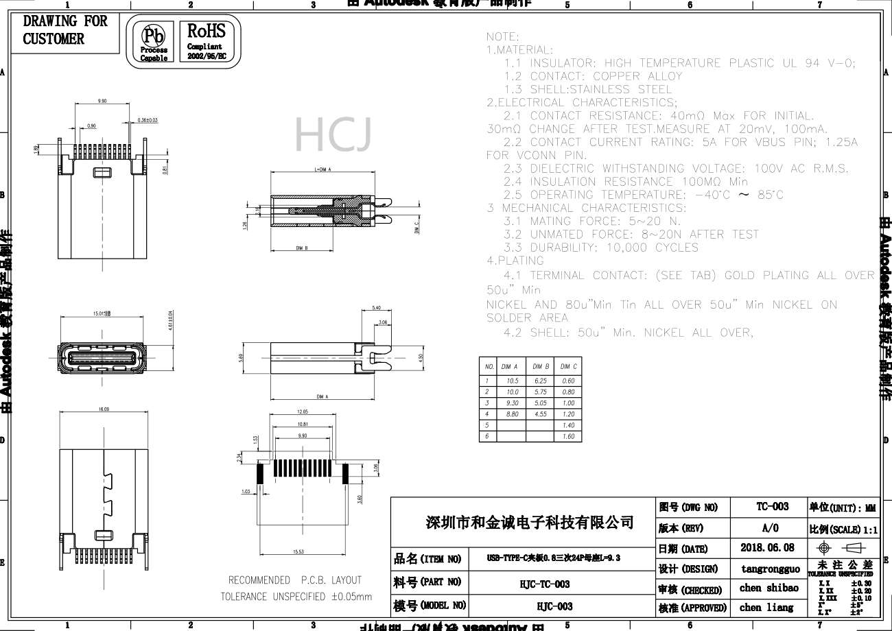 HJC-TC-003 USB-TYPE-C夹板0.8三次24P母座L=9.3
