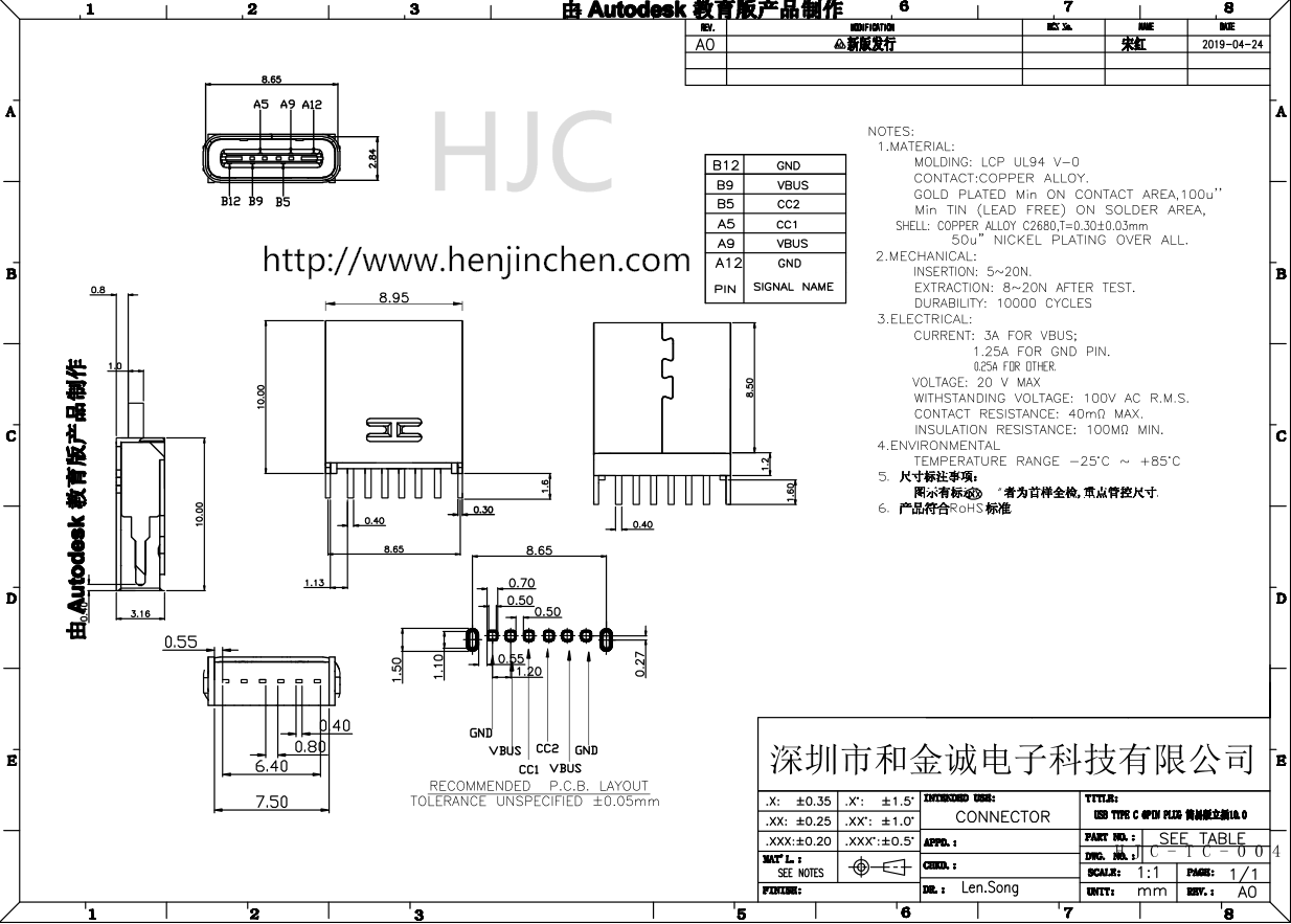 HJC-TC-005 USB -TYPE-C 180度直插6P母座L=10.0