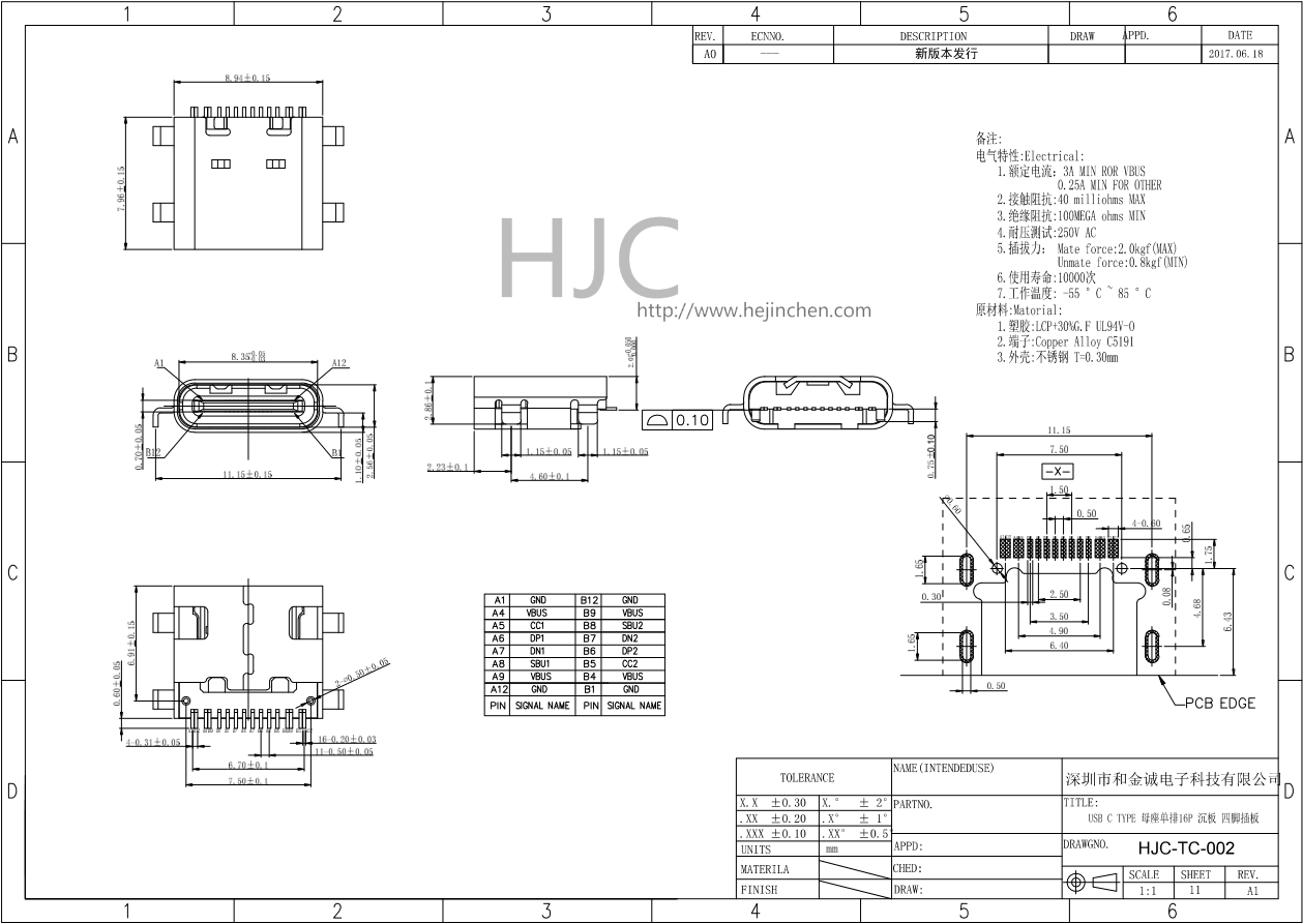 HJC-TC-001 USB-TYPE-C 四脚前插后贴4P母座 L=6.85