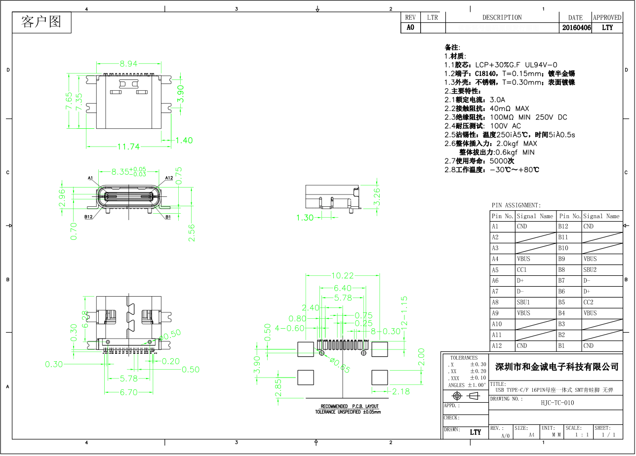 HJC-TC-008 USB -TYPE-C沉板1.2前插后贴24P母座 L=10.0
