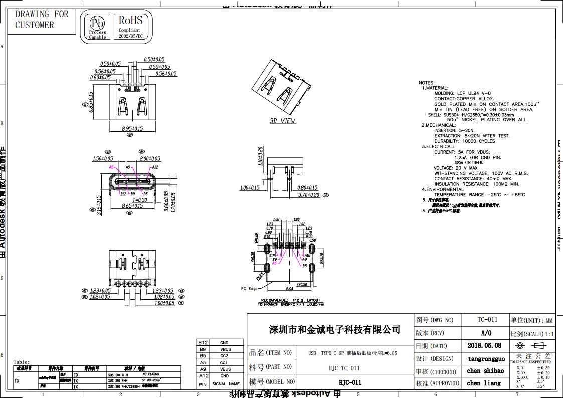 HJC-TC-011 USB-TYPE-C 四脚前插后贴6P有弹母座 L=6.85