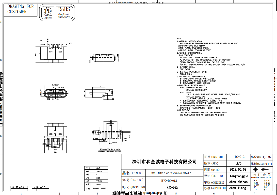 HJC-TC-012 USB-TYPE-C 180度直插6P母座 L=5.0