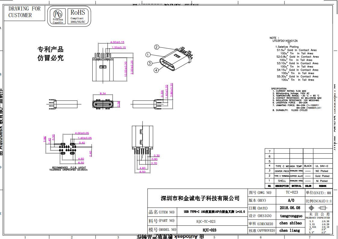 HJC-TC-023 USB-TYPE-C180度直插鱼叉脚14P母座 L=10.0