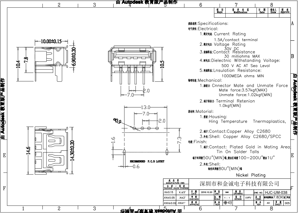 HJC-UM-039 AF 180度直插直边双面插母座 L=11.7