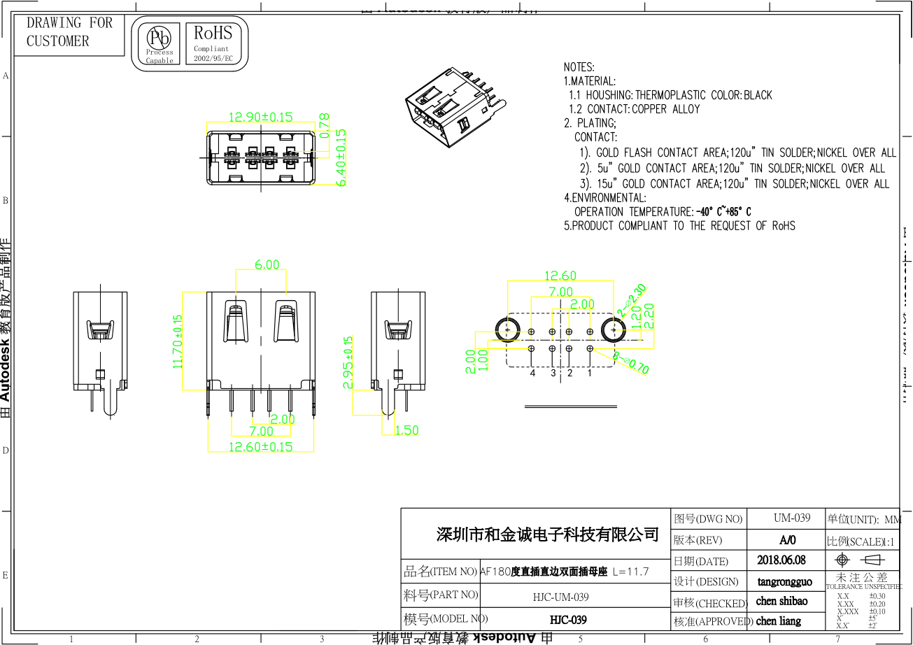 HJC-UM-039 AF 180度直插直边双面插母座 L=11.7