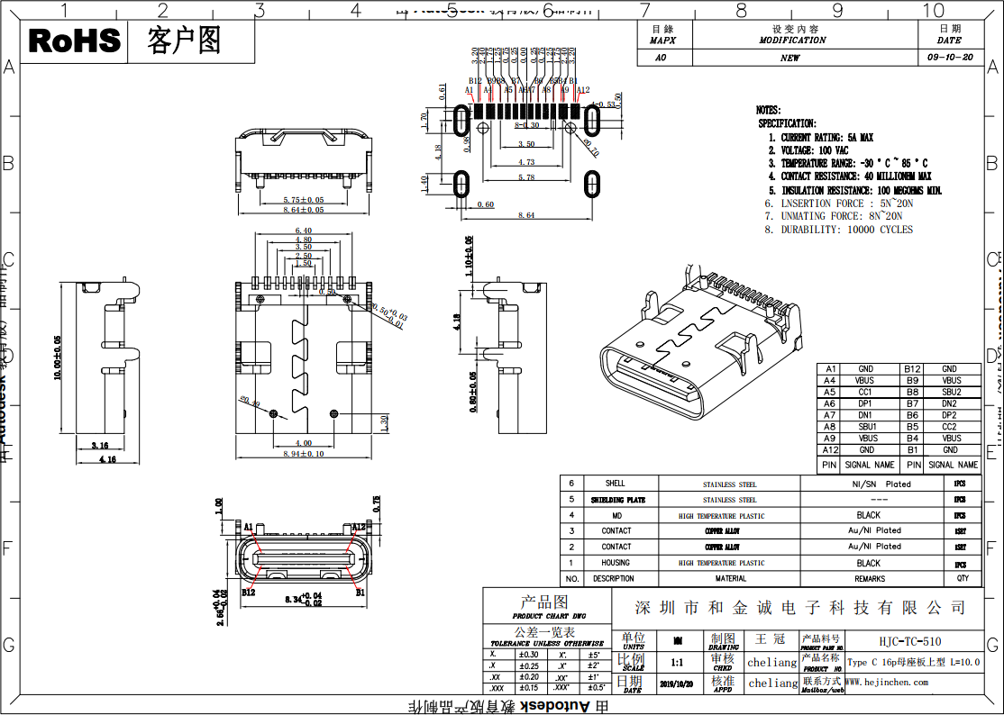 USB TYPE-C-16P 四脚插端子SMT加成外壳L=10.0MM
