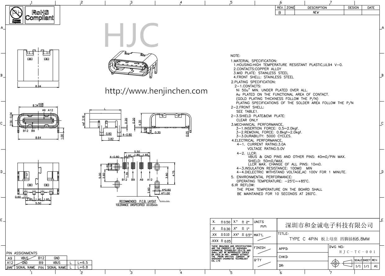HJC-TC-005 USB -TYPE-C 180 degree direct insertion 6P female L = 10.0