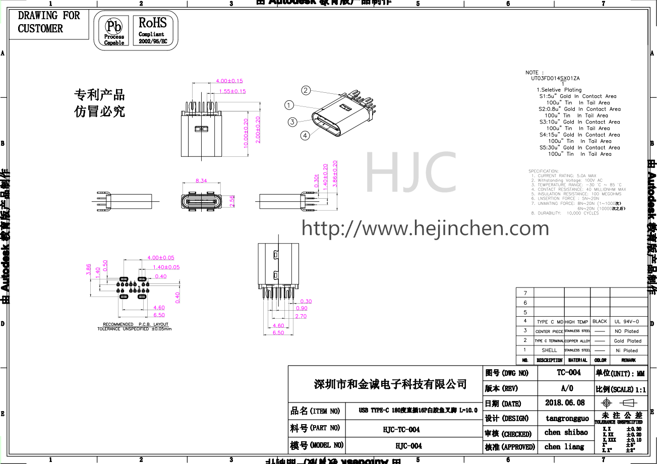 HJC-TC-004 USB TYPE-C 180 degree inserted 16P white gluefire foot L = 10.0