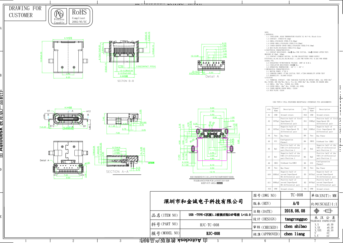HJC-TC-010 USB -TYPE-C four feet full stickers 16P master black glue L = 7.35