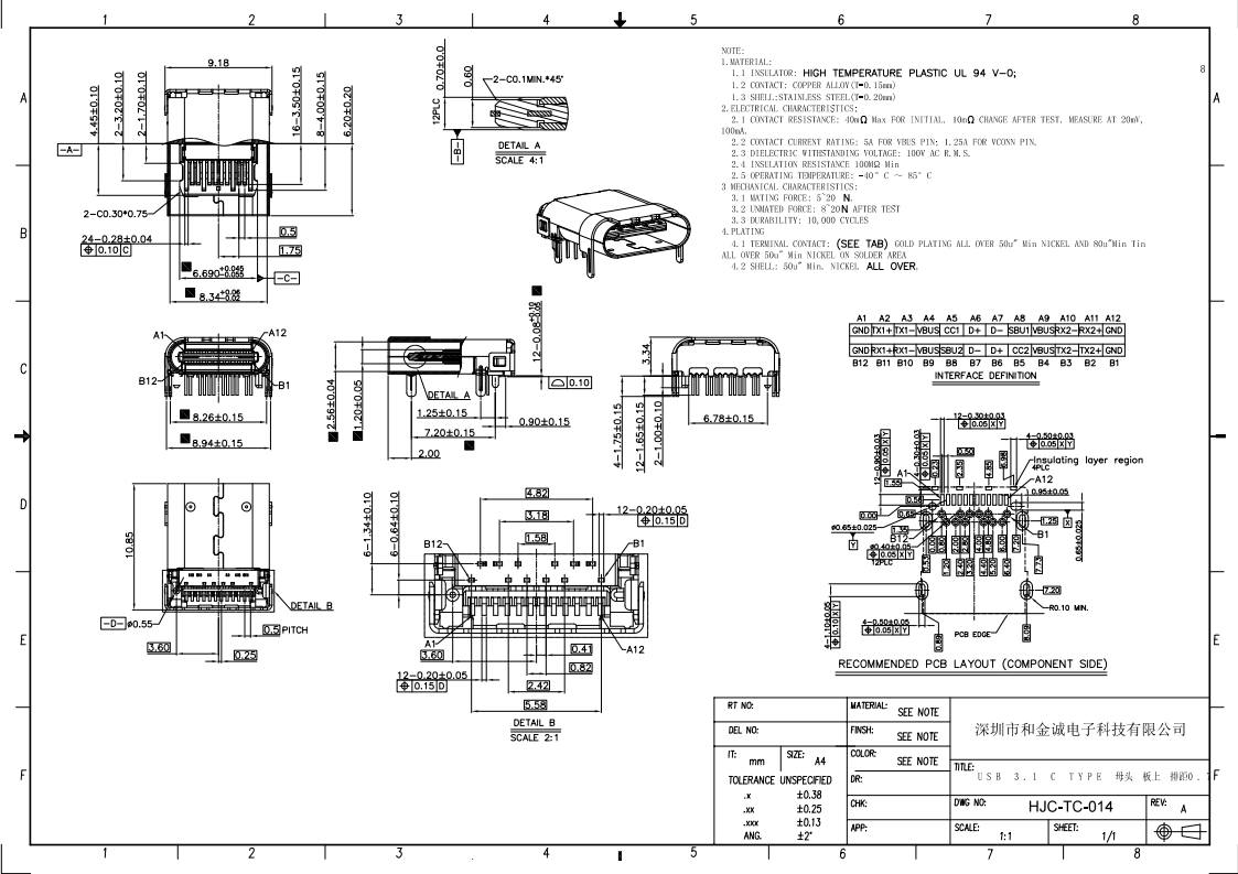 HJC-TC-014 USB -TYPE-C four feet before inserting 24P female L = 10.5