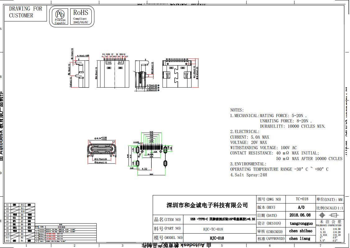 HJC-TC-018 USB -TYPE-C four feet forward plug post 16P female black glue L = 8.35
