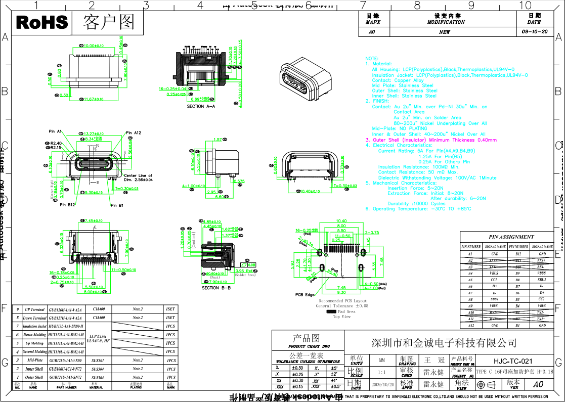 HJC-TC-020 USB -TYPE-C 180 degree direct insertion 16P full plastic seat L = 10.0