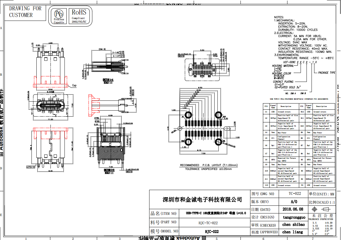 HJC-TC-023 USB-TYPE-C180 Direct Intraque Since Foot 14P Size L = 10.0