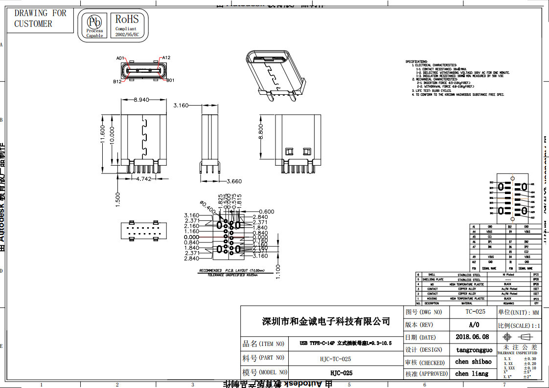 HJC-TC-025 USB TYPE-C-14P Vertical plug-in board female seat L=9.3-10.5