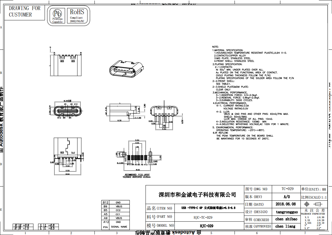 HJC-TC-029 USB TYPE-C-6P vertical mount female seat L=6.5-6.8